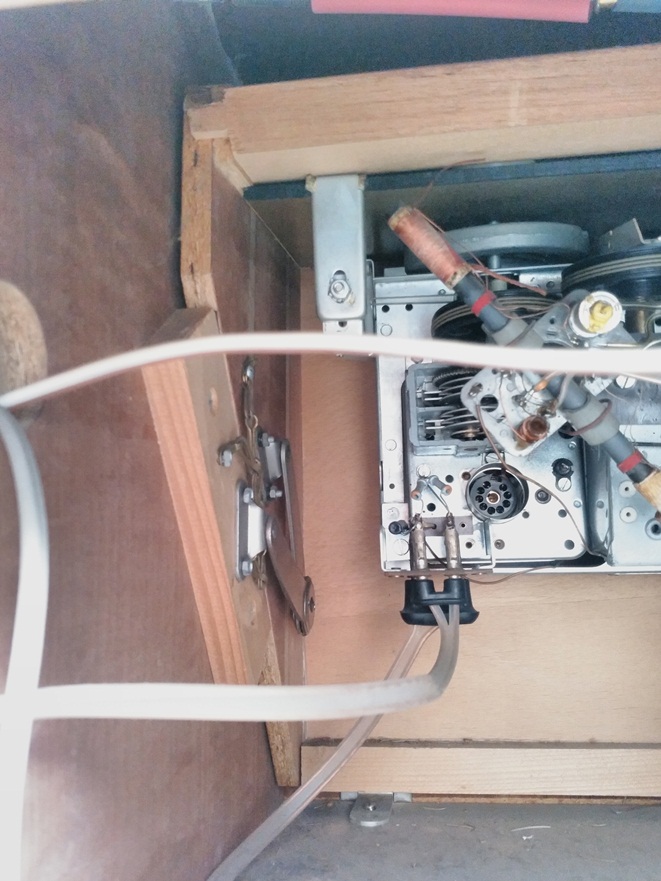 Loewe Opta denkt sich immer etwas besonderes aus, selbst wenn ich alles abgebaut hätte, was du vorgeschlagen hast, wäre zwar der Frontdeckel bis in die Waagerechte gekommen aber nicht zu lösen gewesen. Auf den diesmal verwendetet Trick bin ich durch die besagten Scharniere gekommen. Zwischen diesen ist noch ein Klavierband verbaut, es gibt also 2 Drehachsen, wozu? Die Lösung ist ein 2 teiliger Deckel. Die Verbindungsschrauben sitzen so an der Vorderkante, dass man sie im Betrieb nicht sieht. Dann klappt der Deckel auf und dahinter ist ein Rahmen, an dem das Chassis wie üblich von unten (diesmal von vorne) befestigt ist. Gut dass ich vorher die Isabella draussen hatte, es gibt noch ein Hindernis. Das Loewe Chassis hat auf dem Ferritantennenträger einen Lufttrimmer, der nicht durch die hintere Öffnung passt. Das Chassis muss leicht verkantet durch den vorderen Rahmen nach vorne herausgezogen werden.