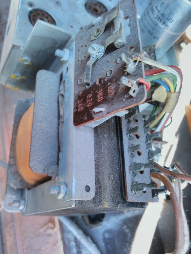 Meine Vermutung ist, dass sich hinter dem Chassis am Deckbrett der Truhe an den vier Stiftschrauben die Nachhallspirale befunden hat. Hinter dem von vorne rechten Tieftonlautsprecher befinden sich hinten 2 Stiftschrauben und vorne die Vorrichtung für eine Blechlasche, die ich so von dem separaten Trafo aus der Nordmende Visabella 1965 kenne.