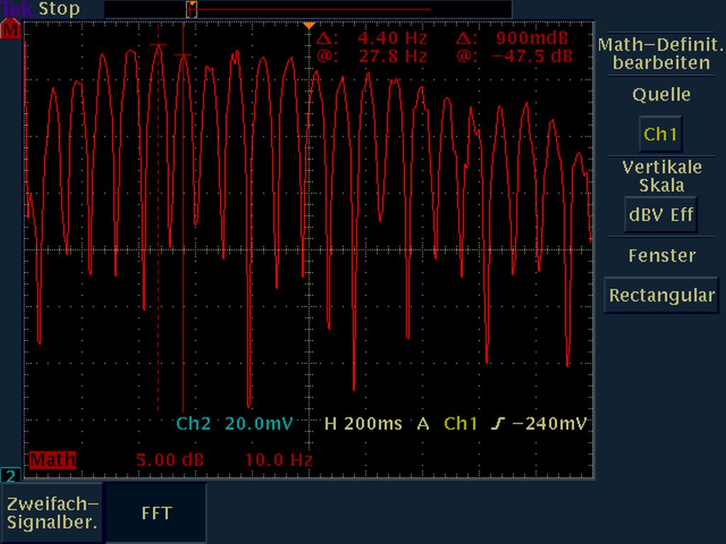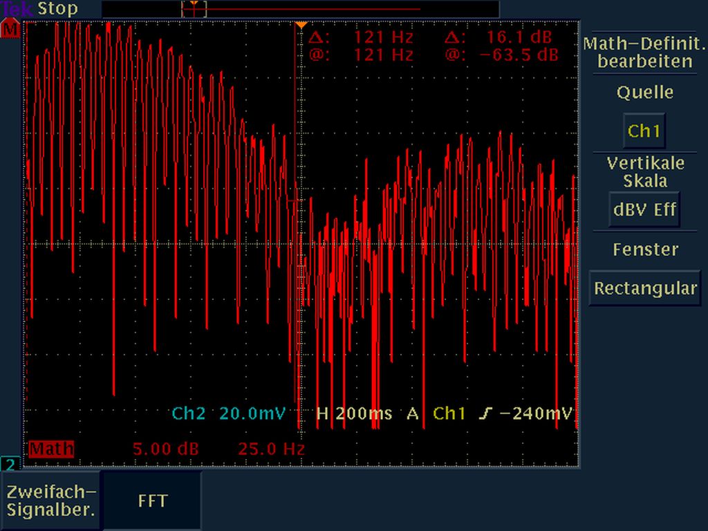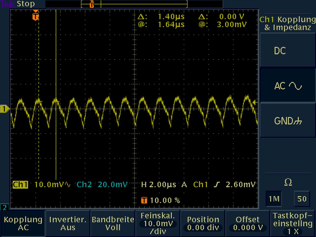 Ich habe jetzt mal einen 100Ohm (statt 220Ohm) Widerstand als RL genommen. Nun ging auf der Powerbank eine LED an, so wie es auch beim Ladevorgang geschieht. Auch hier sah ich keine Pulse mehr, weshalb ich vermute, dass diese Signale eine Art von An-(Ab-)schaltkontrolle des Wandlers sind. Mir fiel auch auf, dass sich jetzt die Clockfrequenz auf ca. 714kHz geändert hatte. Davor lag sie bei ca. 36kHz.