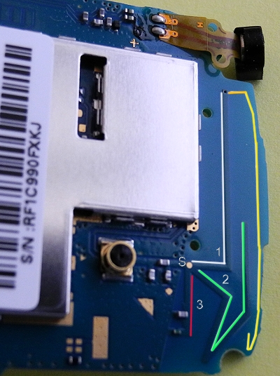 Zur besseren Erkennung der linearen Drahtantennen auf beiden Seiten der Platine habe ich die Leitungen farbig markiert: S=Speisepunkt 1= 900 MHz-Antenne 2= 1800 MHz-Antenne 3= Anpass-Leitung für Impedanz, usw? Gelb= Antennenfortsetzung der Antenne 1 auf hinterer Platinenseite