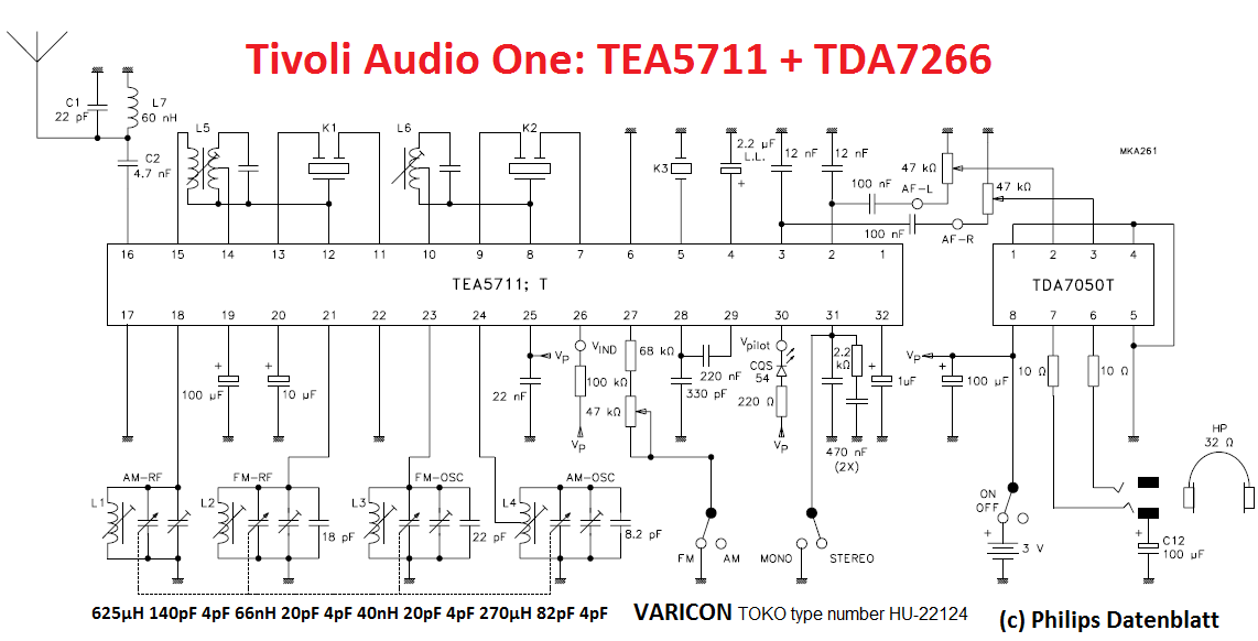 Im Tivoli Audio One befindet sich ein Einchip-Radio-IC des Typs Philips TEA5711T. Das Philips Datenblatt empfiehlt folgende Schaltung zusammen mit dem TOKO VARICON HU-22124. Alles obsolete Technik aus heutiger Sicht.