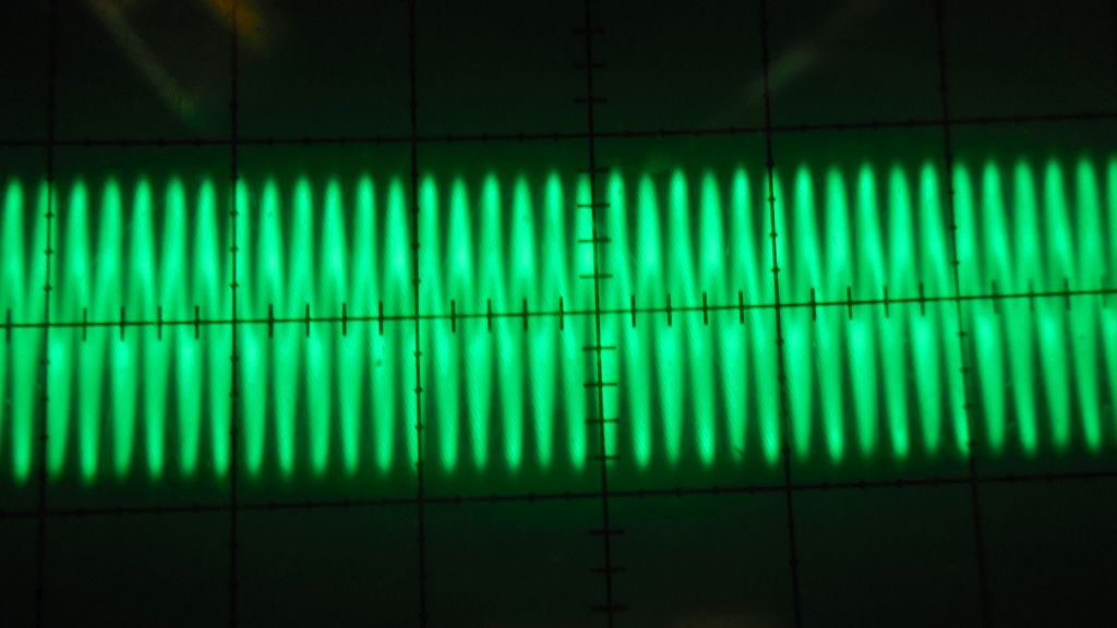 also, bis 200MHz ist der Oszi gut zu gebrauchen, wenn man auf die Genauigkeit der Amplituden einen nicht so grossen Wert legt. Bei höheren Frequenzen wird der Strahl sehr unscharf, bis man dann nur noch einen hellen Balken sieht, dessen Amplitude bei noch höheren Frequenzen jetzt deutlich abnimmt. Als ich allerdings in die Region über 500MHz kam sah ich plötzlich eine Resonanz. Ich habe jetzt mal statt dem sehr kurzen Koax-Verbindungskabel ein längeres verwendet. Die Frequenz war fast gleich. Auf einem parallel angeschlossenem Oszi kann man diese Oszillation erkennen. Aus irgendeinem Grund kommt der Tek in einem ganz kleinen Bereich in Resonanz.