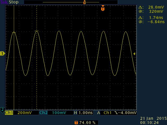 genau das ist es, was mich so verwundert. Die höchste Auflösung von dem Oszi ist 0,05us/Div. 5Perioden/Div wäre also die höchste Auflösung (100MHz). Mein Colpitt-Oszillator schwingt aber (bei dieser Aufnahme) auf ca. 570MHz. Ich habe das gleiche Signal noch einmal mit einem 500MHz Oszi (Tektronix TDS3052B) gemessen. Das Ergebnis sieht man im angehängten Bild.