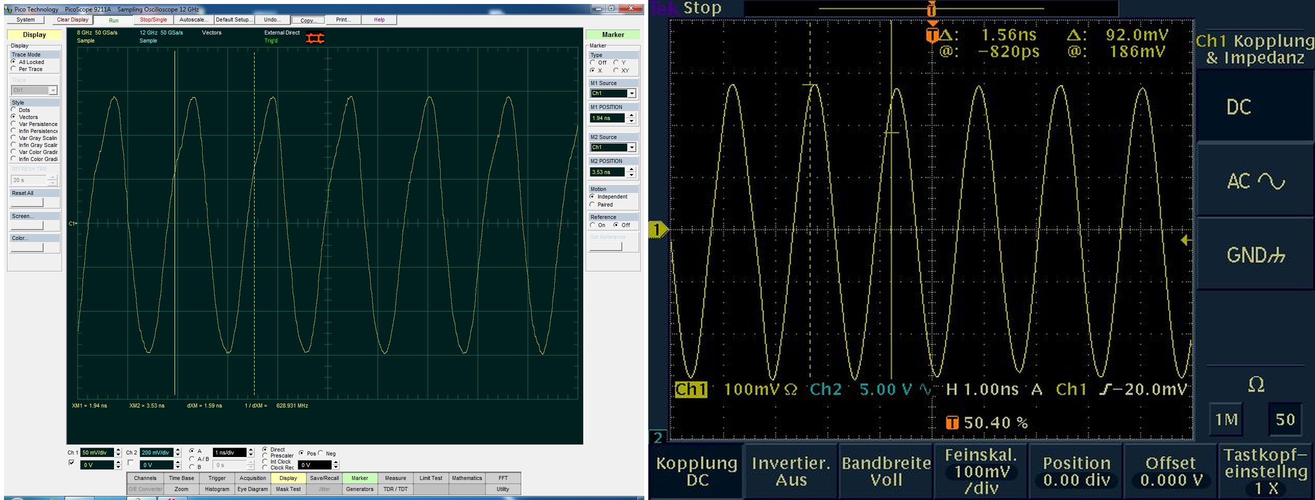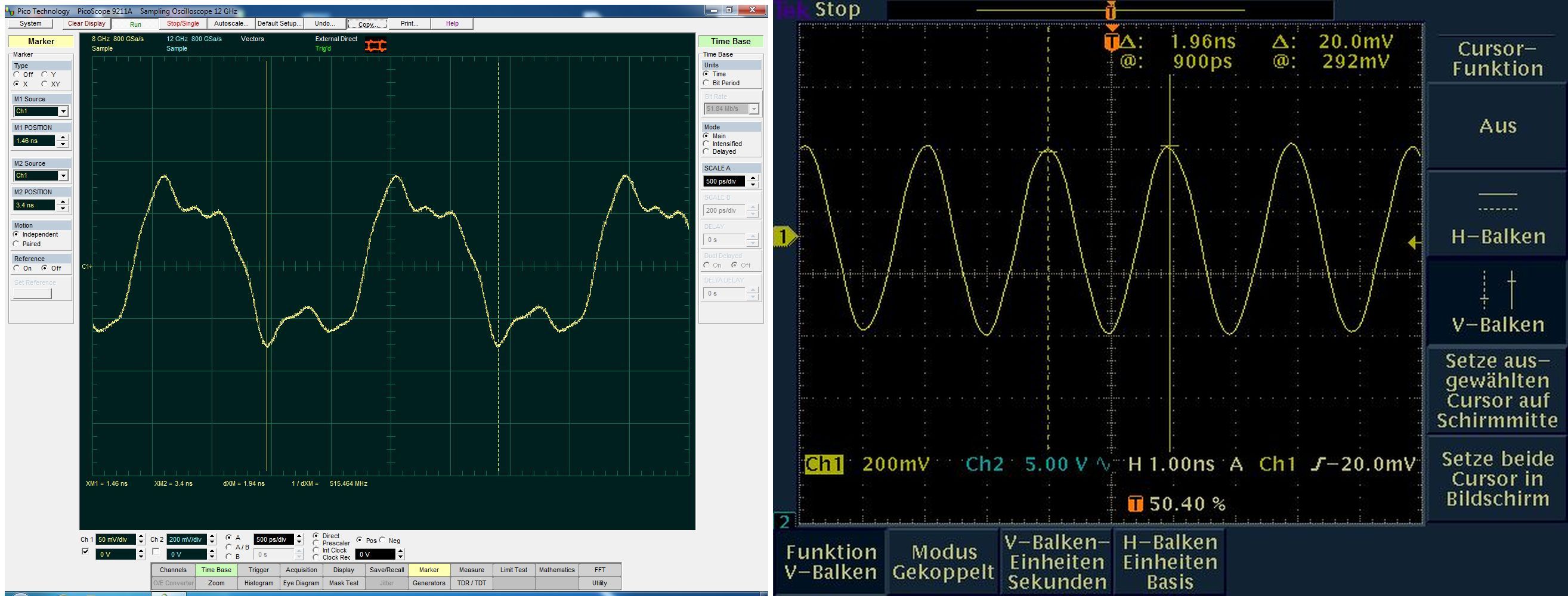 mit einer Schaltung, die zur Ansteuerung einer Laserdiode dient, erzeuge ich Frequenzen im Bereich >500MHz. Die Signale messe ich mit einem TEK3052B. Ich sehe hier auf dem Scope einen sauberen Sinus (Bild1 rechts). Vor kurzem habe ich in der Firma ein PicoScope9211A bekommen. Mit diesem Scope sehen die Signale jedoch nicht so gut aus. Daraufhin habe ich meine Oszillatorschaltung verbessert und bin doch zu einem recht guten Ergebnis beim PicoScope gekommen (Bild2 links). Was mich allerdings irritiert, warum sehe ich auf dem TEK so einen perfekten Sinus. Es sieht so aus, als ob er im Eingang schwingen würde. Bei beiden Oszis habe ich das Signal über ein RG58 (sowie RG174) Koaxkabel (mit 50Ohm Abschlusswiderstand) eingespeist. Es ist allerdings egal, ob ich beim TEK mit 50Ohm abschliesse, oder nicht. Es ändert sich nur die Amplitude ein wenig. Hat vielleicht jemand eine Ahnnung, was die Ursache für diese 'Signalverfälschung' sein könnte? Ich messe mit dem Scope seit vielen Jahren, aber mir ist es nie in den Sinn gekommen, dass die Messungen verfälscht sein könnten.