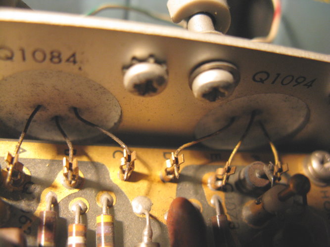 Hallo Martin, Die drei Anschlüsse der zwei Transistoren Q1084 und Q1094 habe ich mit Watte-Stäbchen, die Watte besprüht mit Kontaktspray, gereinigt bis die Anschlüsse blank und sauber waren. Auf der Watte war, nach der Reinigung der Anschlüsse, viel schwarzer Schmutz. Messungen und Ergebnisse hier zur Information:
