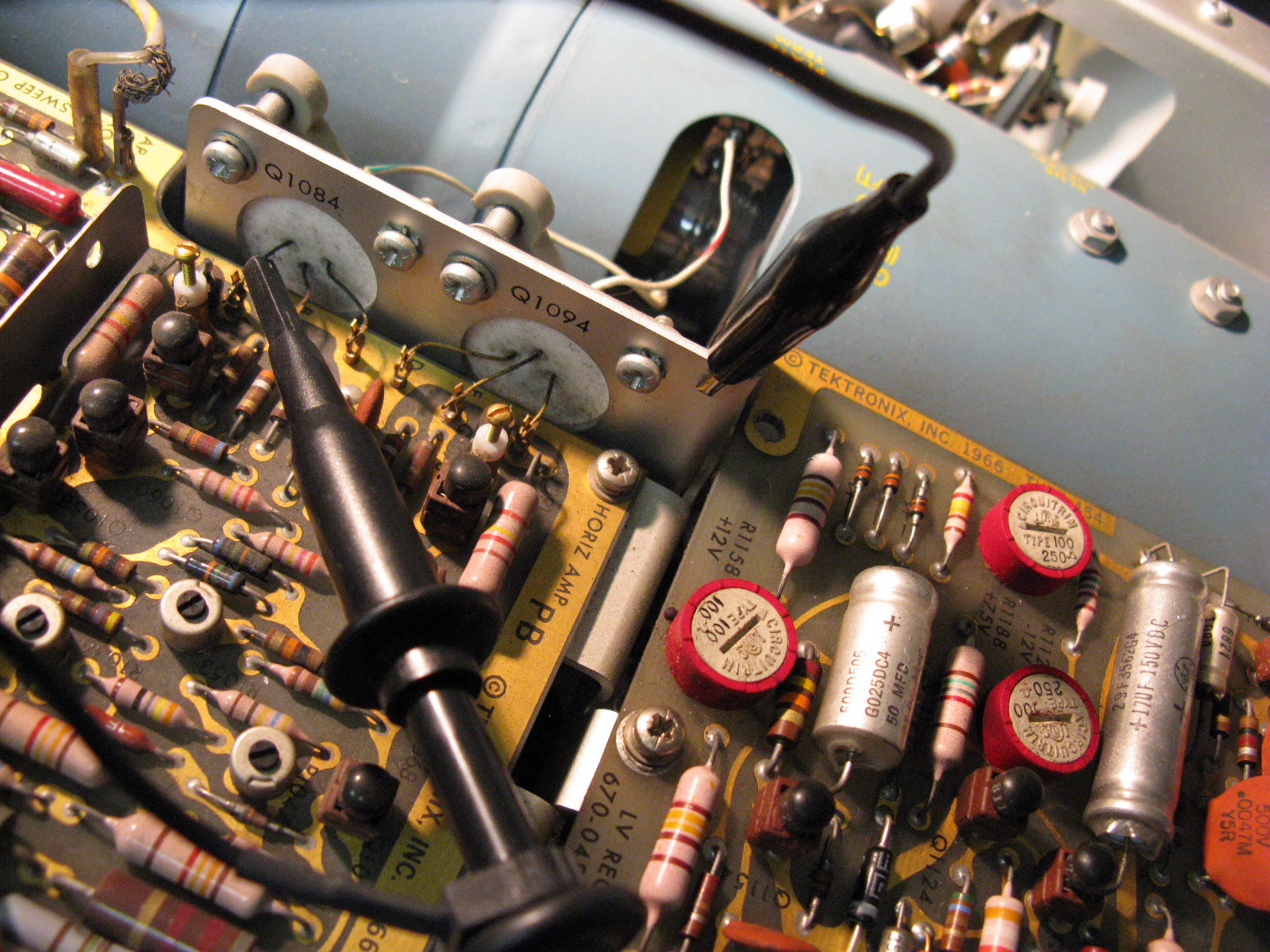  Q1084 mit Bas. und Koll. Anschlüssen (Em. ist ja für beide Transistoren an gnd) an die Klemmstecker von Q1094 mit Leiterbrücken angeschlossen. Anzeige OS250A (Einstellungen Time/Cm 1 ms und Volts/Cm 0,1 V), saubere, scharf gezeichnete Sägezahnkurve. Beam: Vert. Mitte. Horiz. Position 6,5. Beamschalter nach unten gedrückt: Beam auf Position 5.