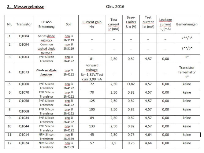 Hallo Martin, Hier die Zusammenfassung meiner Messungen und Versuche an den 12 Transistoren wie von Dir am 22.10.2016 vorgeschlagen. Messgeräte: 1.1 Oszi: Gould-Advance OS25A 1.2 Atlas DCA model DCA55 Semiconductor component analyser 1.3 Digital Multimeter DÜWi 07977 1.4 Analog Multimeter Voltcraft VC-5080