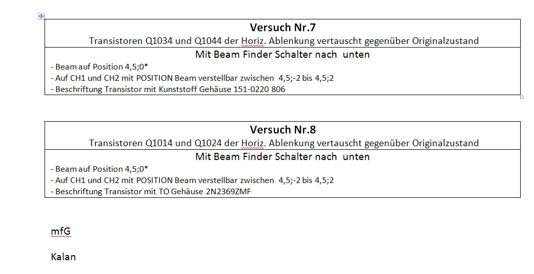  Bas. und Koll. von Q1094 mit Leiterbrücken unter Beachtung der Klemmstecker für Bas. und Koll. an Klemmstecker von Q1084 angeschlossen (gleichwertig mit Transistortausch). Anzeige OS250: Tastkopf auf Kollektor von Q1084 eine saubere und scharfe Sägezahn Kurve. Beam: rechts. Beim nach unten drücken des Beam FINDER Schalters Punkt bewegt sich in etwa 25% der Skalenbreite nach links. Horizantale Verstellung nicht wirksam.