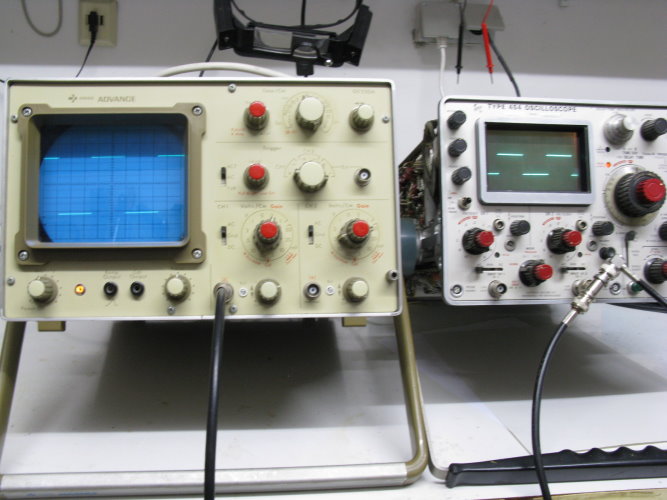 Hallo Martin und alle andere, Mein Tek 454 ist aufgewacht! Das macht schon Freude die ich gerne an Euch aus dem Forum hiermit mit Dank für die erhaltene Hilfe weitergebe. Kurzbericht dazu: Nachdem die Versorgungsspannungen überprüft und die defekten Transistoren auf Schaltplan 11 Horizontal Amplifier, Section 9 Diagrames, mit Hilfe von Martin´s Vorschlag gefunden waren, habe ich zwei npn Silizium Transistoren 2N3501 in Berlin und 12 pnp Silizium Transistoren 2N4122 in London, jeweils gefunden und gekauft. Diese Transistoren sind im Handbuch Section 7, Electrical Parts List, als Ersatzteile für die defekten Transistoren angegeben und auch so beschriftet. Von den 12 pnp Silizium Transistoren 2N4122 habe ich zwei, die ja eigentlich nur benötigt wurden, ausgewählt. Es sind das die mit den größten ß. Das auswechseln der Transistoren am Tek 454, selbstverständlich Spannungsfrei gemacht, ging praktisch ohne Werkzeug vonstatten. Tektronix hat das schon bei der Herstellung so vorgesehen und dazu schon 1966 Sockel eingebaut. Nach dem einschalten, aufwärmen, verbinden von CH1 und CH2 mit Testsignal (1 V; 1 kHz) sowie Suche der nötigen Einstellungen, war auf der CRT das so sehr gewünschte Bild zu sehen.