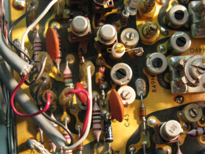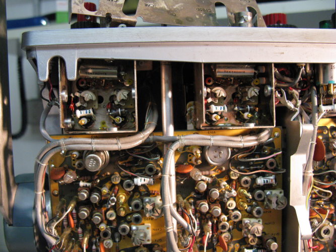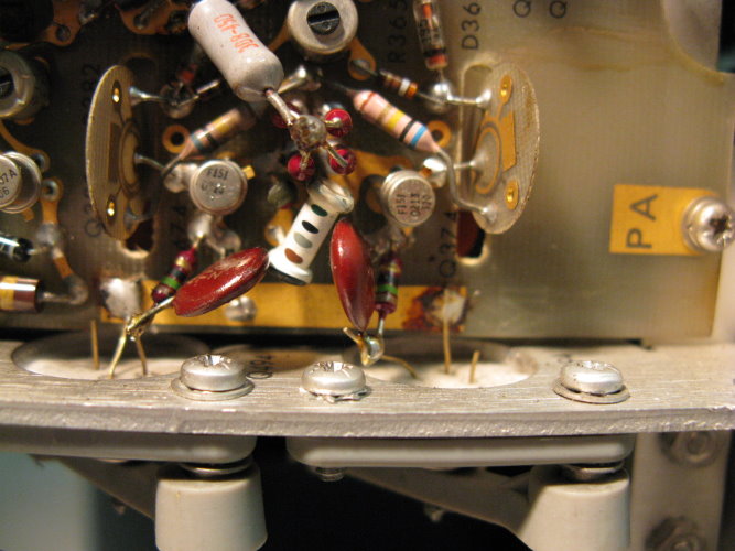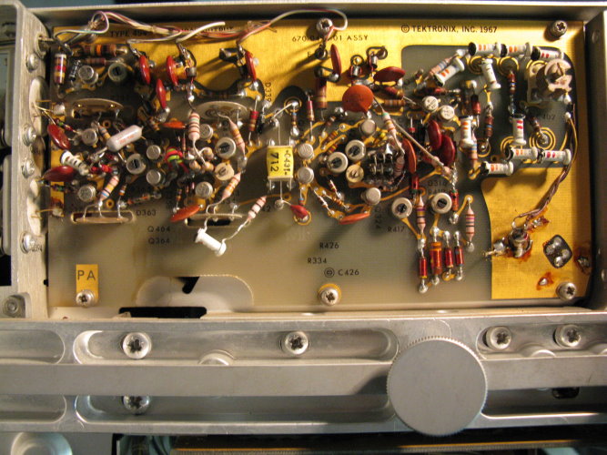 Stimmt. Frage hat sich damit erledigt. Danke. Habe übersehen das die Transistoren Q394/Q494 Typ 2N3866 für die vertikale Ablenkung nur ähnlich (Kollektor am Gehäuse, LEAD CLAMPED TO CASE) mit den Transistoren Q1084/Q1094 Typ 2N3501 für die horizontale Ablenkung, sind. Nicht leicht erkennbarer Punkt im Schaltplan. Bleiben jetzt nur noch zwei Probleme: 1.) Das kuriose verschmorte Bauteil oben rechts auf der Platine Vertical output amplifier. Ist das der Anschluß +/- From Delay Line??? 2.) Durchdrehender roter Knopf bei CH2 Volts/Div. Kann ich die Platine unten, die den Schalter verdeckt lösen, nach unten wegziehen und geht das ohne die Frontplatte zu entfernen???