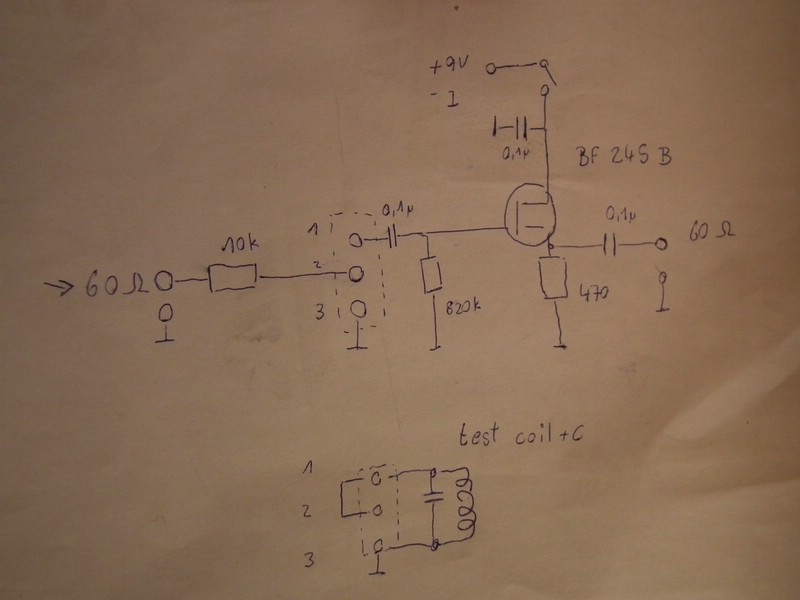 10k von Eingang zu Spule oben 0,1µF von Spule oben zu Gate von BF245 820k von Gate nach Masse Spule unten = Masse 470 Ohm von S nach Masse 0,1µF von S nach Ausgang Drain zu Schalter 0,1µF von Drain nach Masse