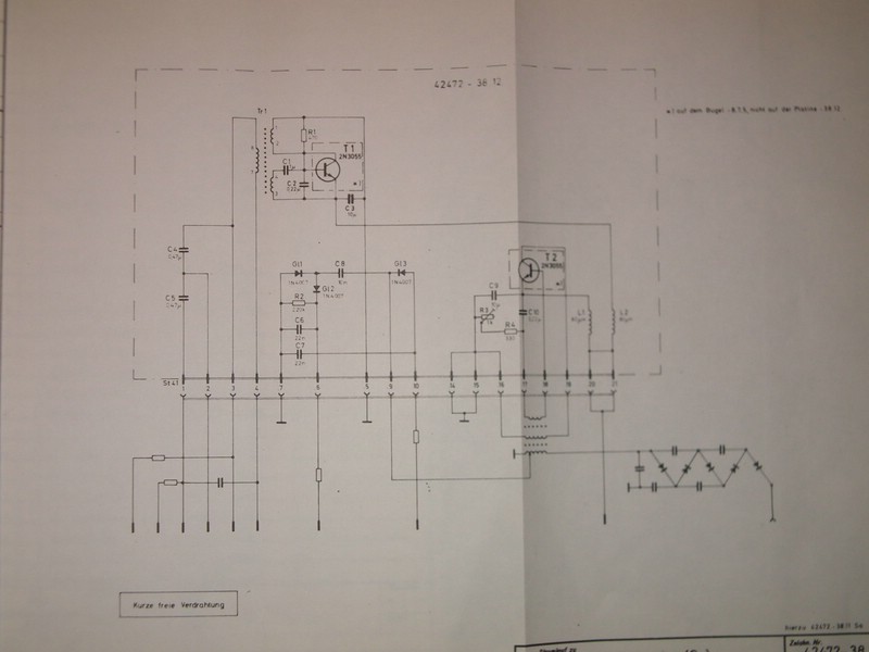 die beiden 2N3055 sind eigentlich zähe Brocken, ich glaub nicht daß von denen einer defekt ist. Untersuch doch bitte mal die Versorgung der Geschichte. Der äußere Steck-Kontakt wo L1 L2 sitzen. Auf deinem Foto ist das an der Platine unten rechts außen. Prüfen ob er schwingt: Oszi auf den Streifen daneben setzen, da muß eine Amplitude zu finden sein. Wenn du oben die eine mittige Schraube losmachst müßte das Ding lose sein und sich aus dem Stecker ziehen lassen.