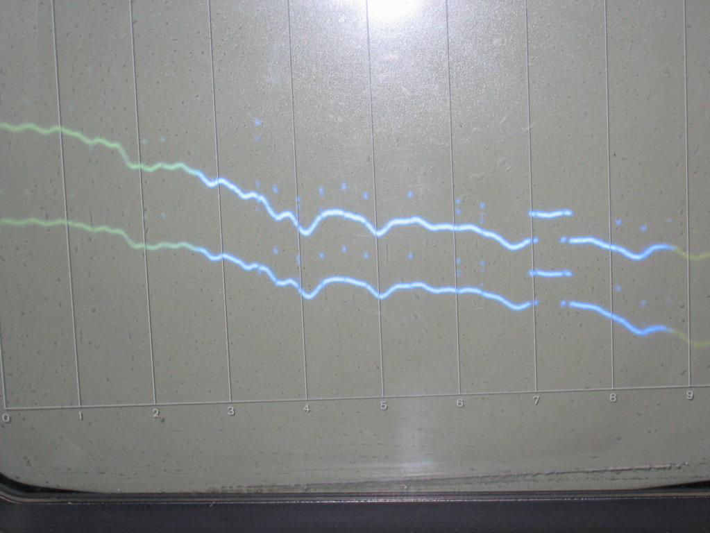 Der Einschub erzeugt eine nicht veränderbare Nulllinie, eine verschiebbare dazu, und vier zuschaltbare verschiebbare dazu. Schalten wir den Markengenerator um auf senkrechte Balken ergibt sich das Messgitter