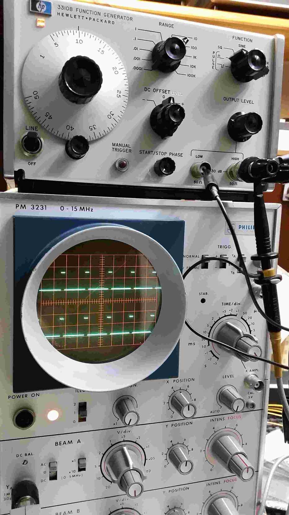 ja die Kleinen und Grossen Schätzchen aus dem traditionsreichen Hause Philips sind durchaus sammelwürdig! Meiner hier gleich in amerikanischer Signal-Fütterung vom legendären 3310B aus dem nicht minder traditionsreich bekannten Hause hp. 1974 starteten dann die "rechteckigen" mit den legendären Industriearbeitspferden PM 3232 ohne Verzögerungsleitung, PM 3233 und mit Speicherröhre PM 3234, die ich dann aus meinem Lehrbetrieb her noch kenne. Die wurden weit über 10 Jahre benutzt.