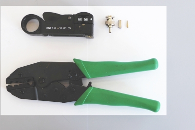 Nun möchte ich eine Alternative zum Löten zeigen. Dies ist wesentlich leichter. Nur braucht man dafür etwas Werkzeug. Eine Quetsch- Crimpzange für die RG58-Leitung und ein Koax-Abisolierwerkzeug Bild 1. Beides bekommt man z.B. auch bei einem Versandhändler aus Sande. Für 2-3x pro Jahr eine Leitung anfertigen sind die Werkzeuge allerdings etwas teuer.