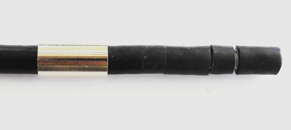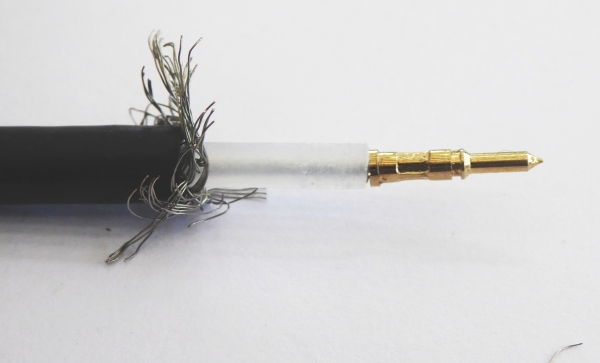 Damit es im Alltagsgebrauch weniger Stress auf die Verbindung gibt, ziehe ich nach der Montage und Kontrolle noch einen Schrumpfschlauf über das Kabel und den hinteren Teil des Steckers, eine Art Low-Cost-Knickschutz. Da der Schrumpfschlauch nicht über den Befestigungsring geht, muss man ihn bereits vor dem Zusammenbau des Steckers über das Kabel schieben.