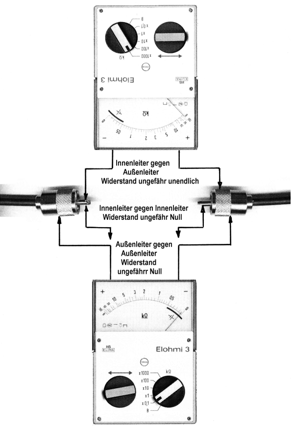 Arbeitsanleitung (so mache ich das) 1. Eine evtl. vorhandene Knickschutztülle, sonst ein Schrumpfschlauchstück und die Quetschhülse über die Leitung ziehen. Wenn der Stecker dran ist, geht es evtl. nicht mehr. Bild 2 2. Leitungsschneider ansetzen und mehrmals drehen (ich mache es immer 5-mal) Bild 3 3. Die abgeschnittenen Stücke abziehen. Bild 4 Manchmal bleiben noch einige Drähte der Abschirmung dran. Dies mit einem Seitenschneider abzwicken. 4. Den Steckerstift über den Innenleiter schieben. Oft ist die Bohrung zu klein. Dann mit einem 1,1 -1,2mm Bohrer aufbohren. 5. Mit der Zange im kleinsten Loch quetschen und die Abschirmlitze auffächern Bild 5 6. in den Stecker bis zum Anschlag schieben, muß einrasten. 7. die Drähte der Abschirmlitze über die Hülse des Steckers legen. Bild 6 8. die Quetschhülse über die Litzendrähte bis ca.1mm vor den Stecker ziehen. 9. die Quetschhülse mit der Zange quetschen. Bild 7 10. Knickschutztülle oder Schrumpfschlauch drüberschieben. Bild 8 + 9 11. Die Leitung mit einem Ohmmeter überprüfen. Bild 10 (Leitungsmessung) Widerstandswerte innen - innen und außen - außen: unendlich, innen – außen: nahezu 0 Ohm