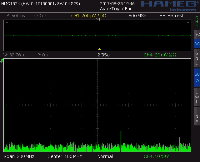 die Empfindlichkeit ist bei der FFT-Darstellung eigentlich nie ein Problem, denn die FFT ist eine Filterfunktion, welche das Rauschen entsprechend der tatsächlichen Frequenzauflösung reduziert, während man im Zeitbereich das totale Rauschen der gesamten Bandbreite des Oszis sieht. Da die Rauschleistung proportional zur Bandbreite ist, bedeutet eine Reduzierung der Bandbreite auf 1/10 eine Rauschreduktion um 10dB. Hat man z.B. in der FFT eine Frequenz-Schrittweite von 15kHz, wird die Bandbreite in diesem Fall von 150kHz auf 15kHz reduziert, was ein Faktor 10000 oder 40dB ist. In Spannung ausgedrückt heisst das, dass das Rauschband vom Zeitbereich (beim Hameg etwa 100uV) in der FFT 40dB oder ein Faktor 100 reduziert wird, also die Empfindlichkeit auf 1uV erhöht wird. Bei konstanten Verhältnissen kann man auch mehrere FFTs mitteln, das reduziert das Rauschen nochmals beträchtlich, aber die Messung dauert entsprechend länger.