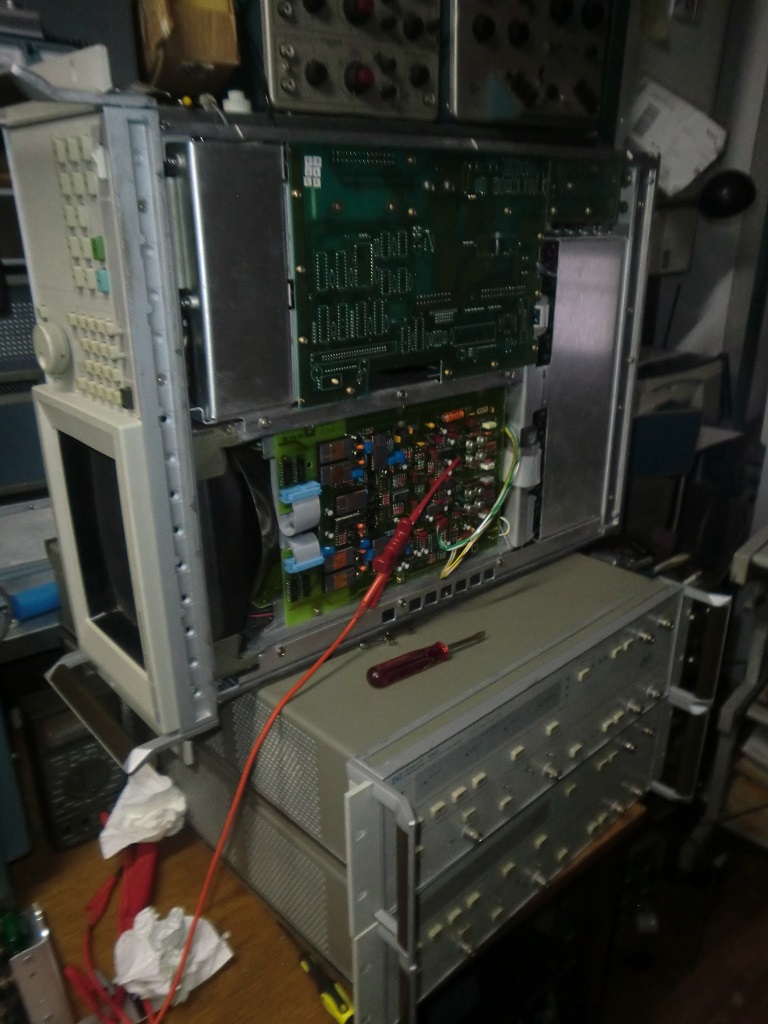 das ist ein HP 51089A (opt. 010 high stability ref) es hat hinten eine Pluginsammlung, da stecken 2x HP HP 51831 Personality Module (ohne Buchsen), und eine GPIB Karte. Der eigentliche Defekt ist aber (ich hoffe das) ausschließlich im analogen X-Y Bereich des Monitors, hat also mit den Karten nix zu tun.