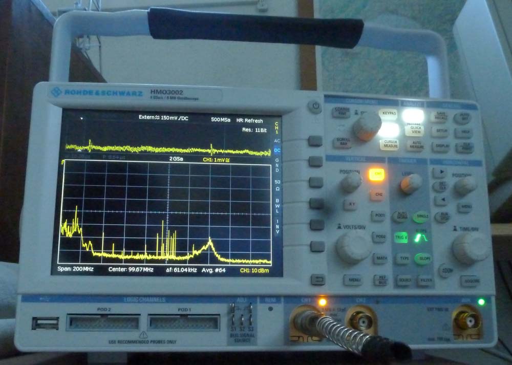 Wie bei fast allen Digital-Oszis gibt es auch hier eine FFT-Funktion, die ganz nützlich ist, hier als Beispiel das Spektrum von 0..200MHz mit einer kleinen Antenne. Man sieht schön die EMV-Verseuchung unterhalb etwa 40MHz, die UKW-Rundfunksender und eine weitere EMV-Verseuchung um 140MHz.