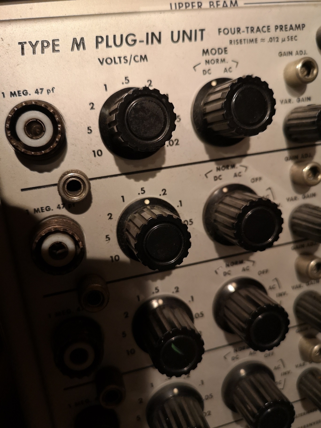 es gibt wie immer auch eine Ausnahme, die ist allerdings extrem selten. Wenn ein alter Tek, der üblicherweise V/cm anzeigt, durch eine Werksoption eine höhere Beschleunigungsspannung bekommen hat dann hat man ihm extra deswegen eine Plexischeibe eingebaut deren Einteilung kleiner ist als 1cm und einen Hinweis darauf gibt daß ein Kästchen auf dem Bildschirm einem cm der Einstellungen an der Frontplatte entspricht, das seht ihr hier