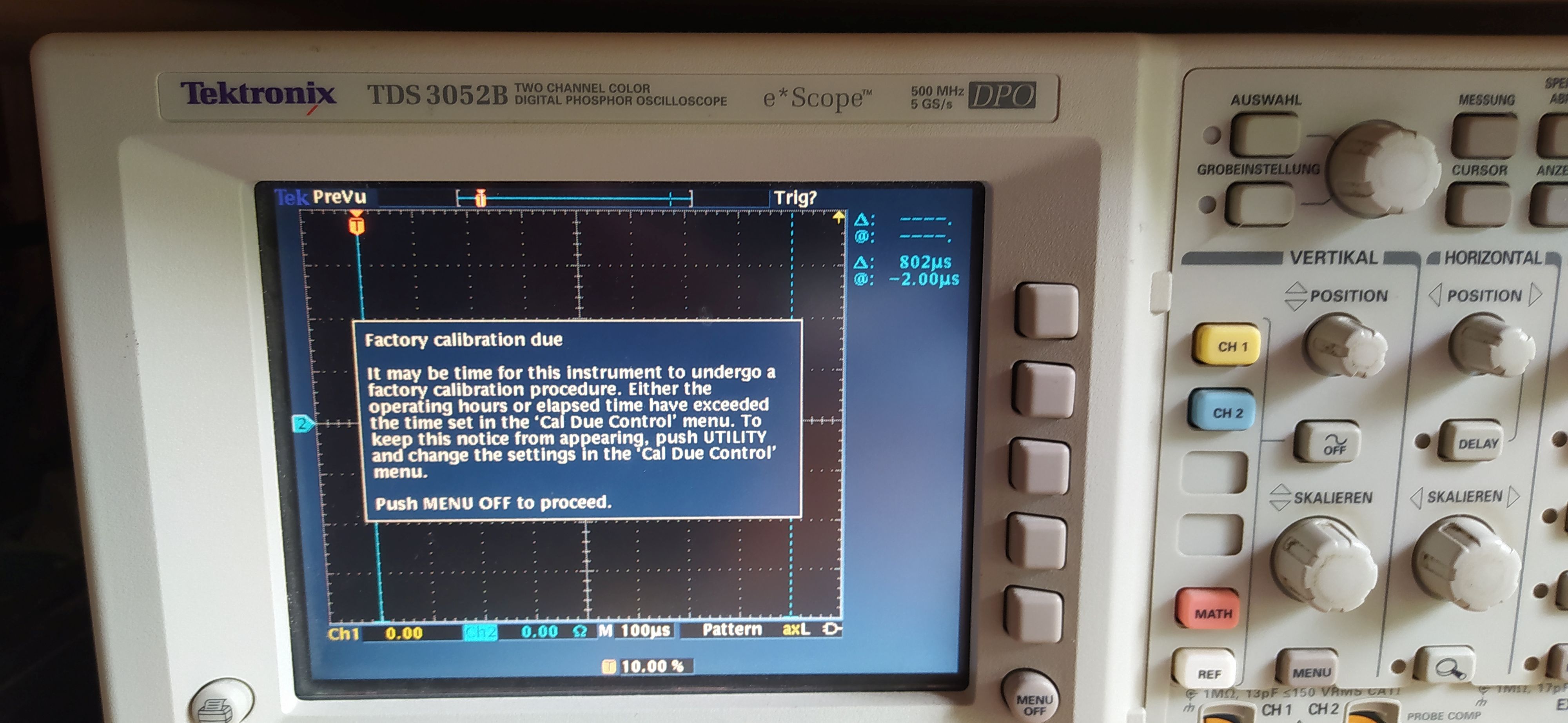 im (dicken) Manual habe ich den Hinweis gefunden, dass man die 'Nutzerzeit' ändern solle. Hierfür muss man ins System Menue (engl.System, de.Dienstprogramm) gehen. Das Problem ist allerdings, dass beim drücken der Taste 'Dienstprogramm' ganz kurz das Menue am unteren Rand auftaucht, doch macht das Oszi zu schnell einen Reset. Im Internet finde ich leider keine Lösung.