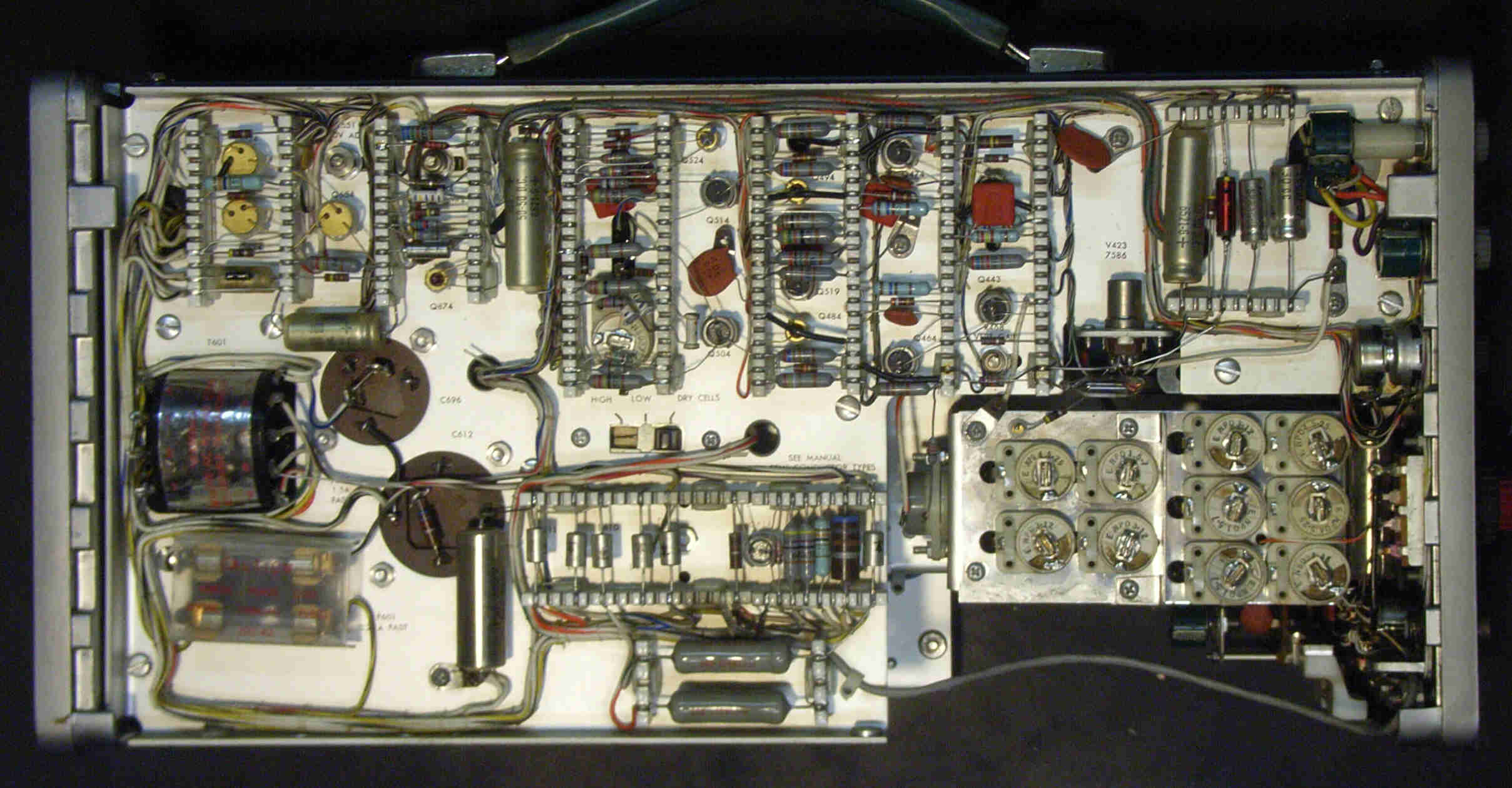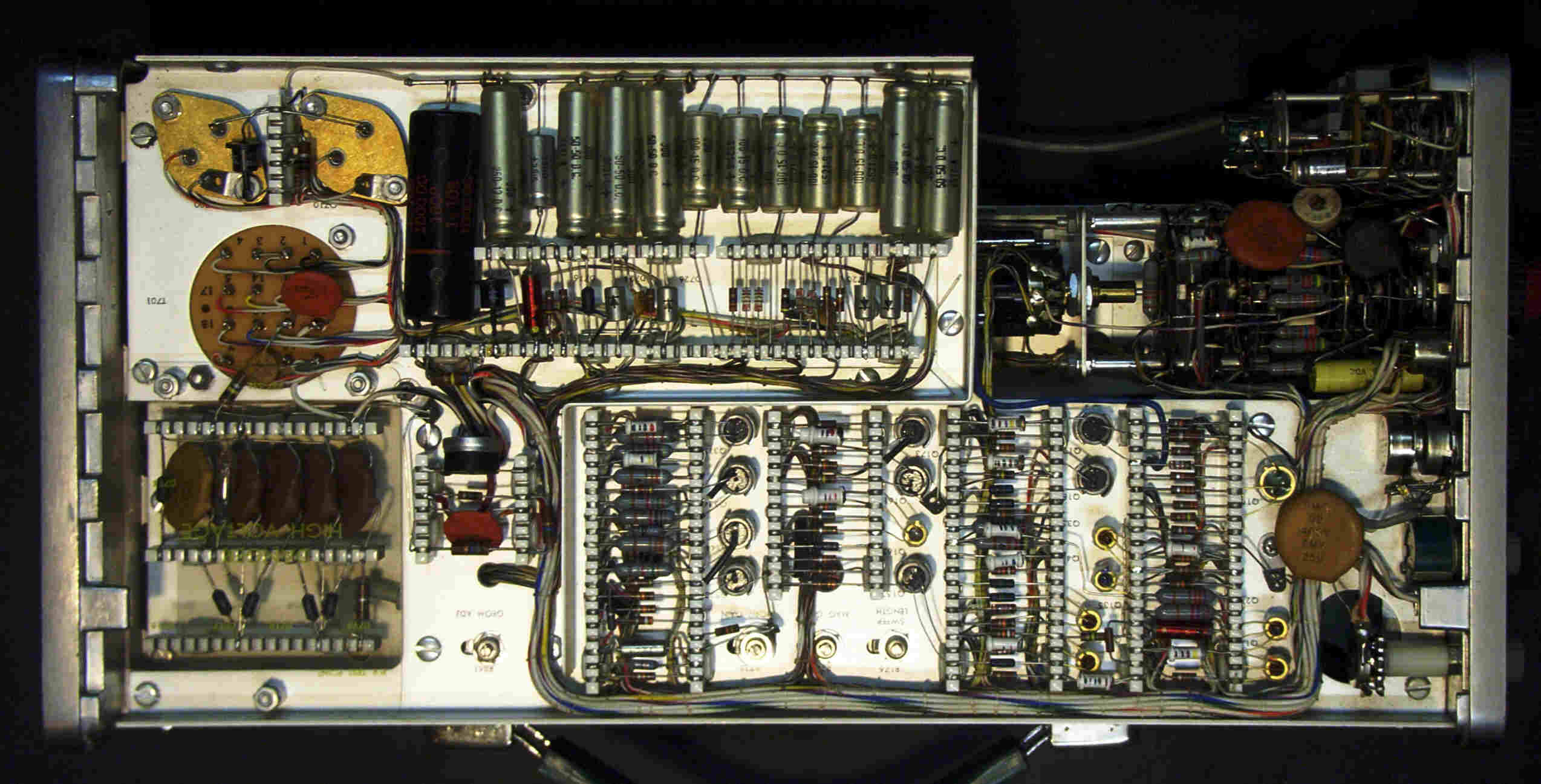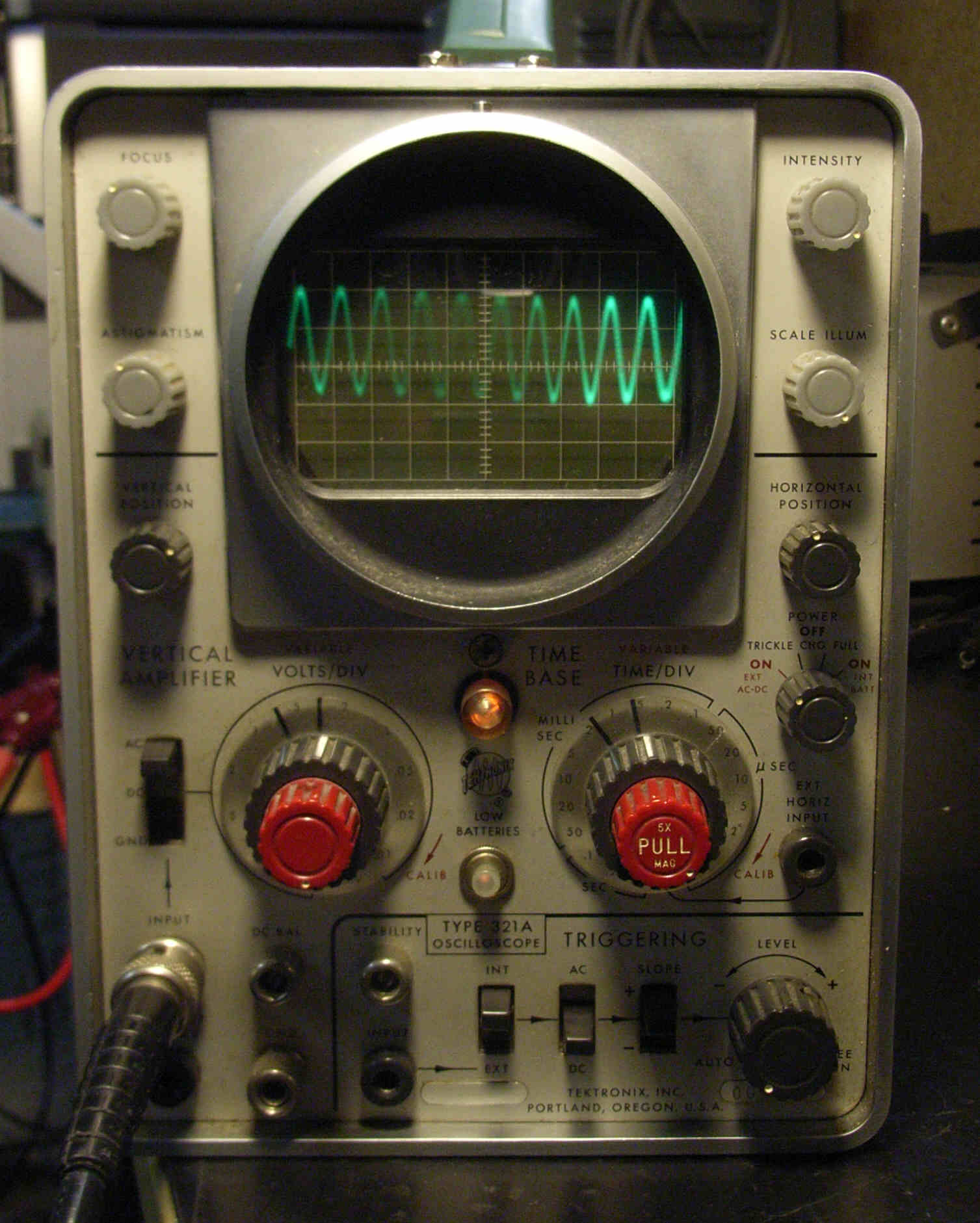 Der 321 war so um 1960 das erste fast volltransistorisierte Oszilloskop von Tektronix. Röhren (Miniatur) waren nur als Hochspannungsgleichrichter (5642) und als Y-Eingangsröhre (5718) eingesetzt. Die Transistoren waren alle Gemaniumtypen. Die erste Info über dieses Gerät fand ich in einem Artikel der Elektronik (Heft Nr. 10/1960). Mein gutes Stück ist das Nachfolgemuster 321A und von 1964. Hier ist als Y-Eingangsröhre ein Nuvistor 7586 und für die Hochspannung eine Verfünffacherschaltung mit Si-Dioden 1N1329 eingebaut. Sonst sind scheinbar nur Ge-Transistoren verwendet worden.