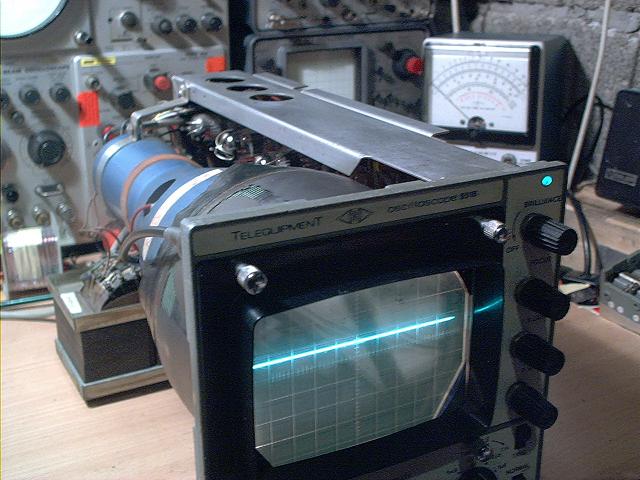 es war nur ein defekter Kondensator, der Telequipment lebt. Er versucht schon vorsichtig zu glänzen ... dauert aber noch etwas. Das Gerätchen ist ausgesprochen warm. "Trace Rotation" funktioniert bei Teleqipment etwa so: Schelle losmachen, Bildröhre drehen, Schelle wieder festmachen...