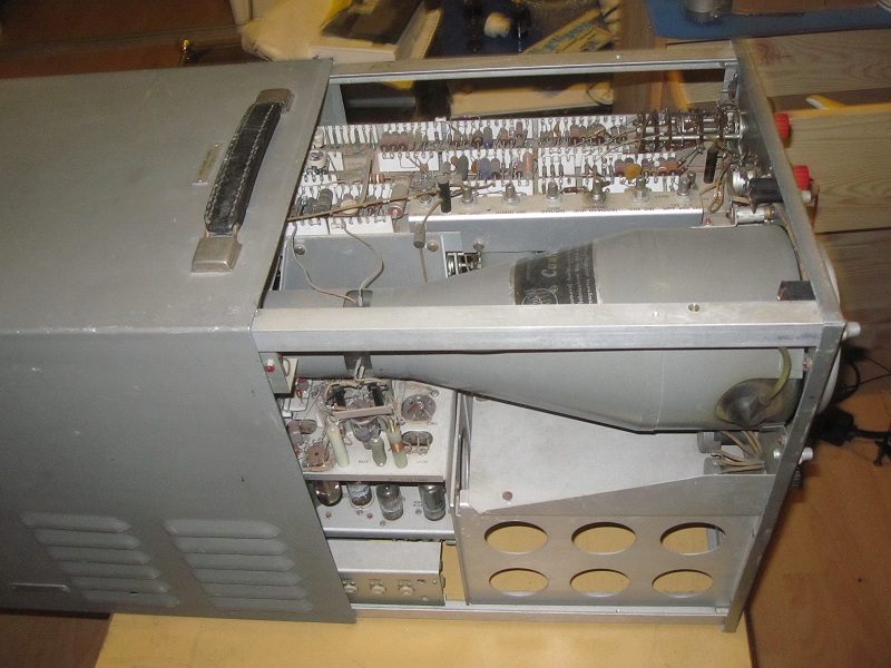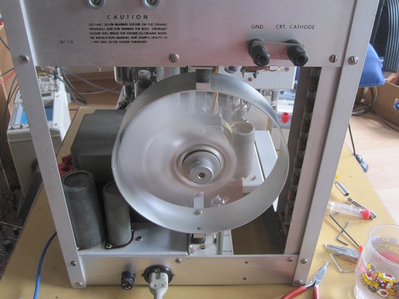 Beim ausbauen von CRT bemerkte ich: Wackelige Sockel von CRT. Sockel entfernen und neuverzinnen von Drähte brachte Erfolg CRT ist nicht von Tektronix gebaut, sondern von Farchild(DuMont), also recht frühe Tektronix. Modell: 5GBP2, fast gleich wie Tektronix T533P2. Spätere Tek hat Tek-Made CRT drin.