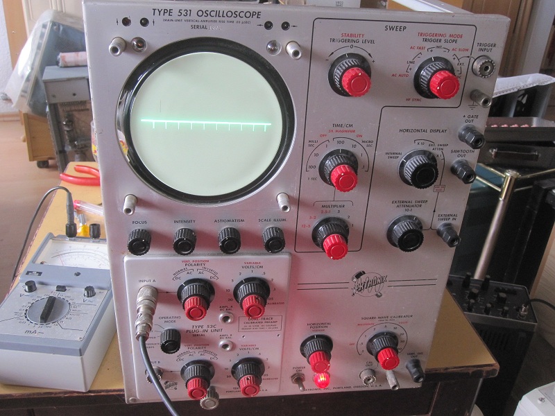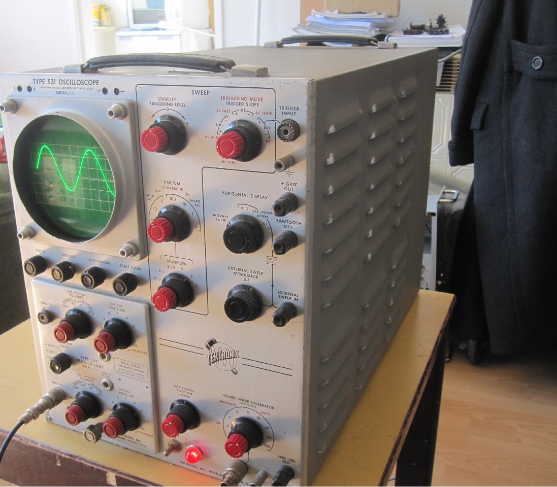 Tektronix 531, eine Sammler hat für mich reservieren Da habe ich Glück: ich kann ihm eigen nennen. nebenbei wird andere 4 Tek abgeholt (in Berlin), paar wird weitere Reise machen (zu martin) 531, hört nicht so super an. Aber es handelt um "early Tektronix", sowas ist in Deutschland sehr sehr selten. Eine Sammler (Kurt) aus USA hat mir erzählen dass *early tektronix* auch in USA recht gesucht ist. Geschätzte Baujahr: 1953-1955