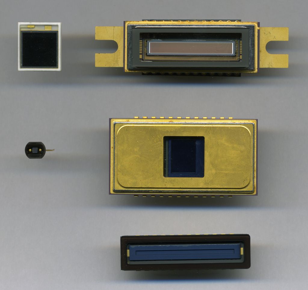 die Idee ist nicht schlecht, hier eine kleine Farb-Kamera einzusetzen. Was mich nur wundert, das ist das 'relativ' gute Ergebnis. Auch wenn man eine Dunkelstrom-Kalibrierung macht, so sind diese Referenzwerte nicht für lange Zeit gültig. Wichtig ist auch, dass der Sensor sich 'warmgelaufen' hat, damit der Dunkelstrom stabil bleibt. Auch sollte die Umgebungstemeratur stabil gehalten werden. Übrigens, das, was man immer bei einem Sensor mit Dunkelstrom bezeichnet, das sind hauptsächlich thermisch ausgelöste Elektronen, wenn man mal Übersprechen, Switching Noise usw. ignoriert. Es ist deshalb von Vorteil, dass man den Sensor kühlt. Zur Zeit ist das ja eigentlich kein Problem. Der Nachteil von diesen Kameras ist, dass sich hier vor der eigentlichen Sensorfläche noch eine Linse und wahrscheinlich eins bis zwei Filter befinden (IR-cut und UV-cut). Normalerweise nimmt man für solche Messungen fensterlose PIN-Photodioden, oder Avalanche-Photodioden. Wenn man CCD's verwendet, dann wäre es das Beste, wenn man fensterlose Back Thinned Typen verwendet. Ich habe mal ein paar Sensoren eingescannt. Links oben ist eine grossflächige PIN-Photodiode und darunter eine APD. Was man im Bild nicht erkennen kann, diese spezielle APD besteht aus ein paar Hundert Einzelellementen, wodurch die Sperrschichtkapazität klein (jedes einzelne Ellement hat einen eigenen Vorwiderstand) und die Diode somit schnell wird (Puls-Halbwertszeit ca. 250ps). Daneben sind drei CCD's. Rechts oben ist ein einstufig gekühlter 'Front Illuminated CCD' mit 1024x64 Pixel. Darunter ist ein einstufig gekühlter 'Back Illuminated' Typ mit 512x256 Pixel. Bei diesen Typen wird ein Teil der Rückseite der Sensorfläche bis auf ca. 20m heruntergedünnt. Diese Art von CCD ist für Beta-Strahlung gut geeignet. Rechts unten ist noch ein ungekühlter Back Thinned Typ mit 2048x1 Pixel.