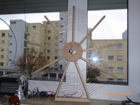13 Windungen (je 1 cm Abstand) immer abwechselnd innen und aussen. 13 Windungen CuL Draht 0,8 mm. Jetzt versuche ich es mit ebenso 13 Windungen, aber immer auf einer Seite. Abstand werde ich mal auf 5 mm verändern. Durchmesser ist 80 cm an den längsten Teilen. Wie bei den Lehrtes Spulen dachte ich mal einen ungeraden Tortenauschnitt an. also 9 X.