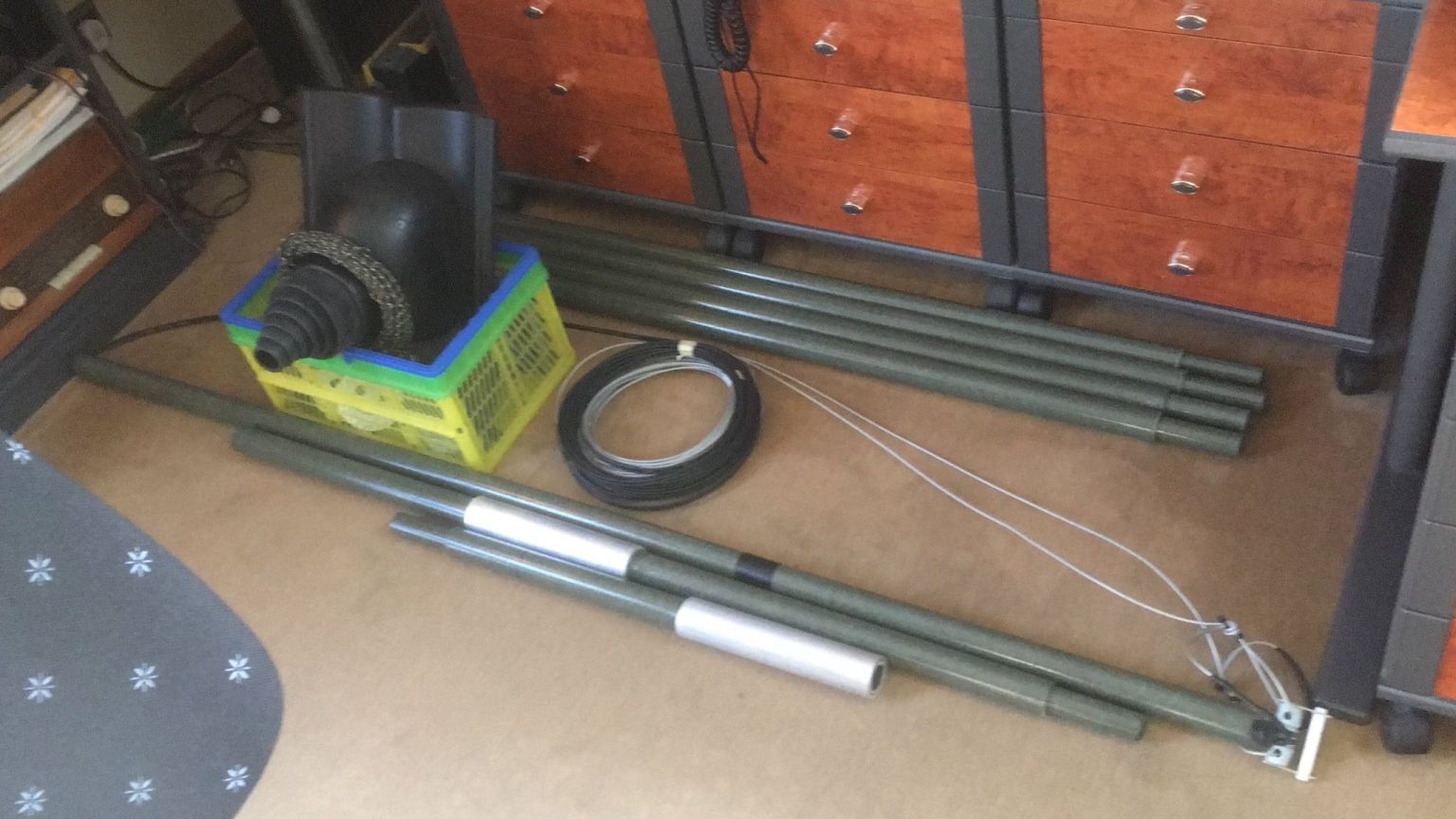 über die Bühne, die wegen Corona 2 Jahre später als geplant stattfand. Ich brauchte eine helfende Hand und wollte das nicht mit meiner Frau durchziehen. Nach mehr als 20 Jahren ist der Fiberglassmast rissig und wasserdurchlässig geworden. Das Wasser fand dann seinen Weg innerhalb des Rohres in den Dachboden, das am Fusspunkt mit Altbeständen "Pampers" aufgefangen werden musste. Ein simples Abdichten des Rohres war aus elektrischen Gründen nicht ratsam, weil dort eine 450 Ohm - Zweidraht - Bandleitung geführt wurde.
