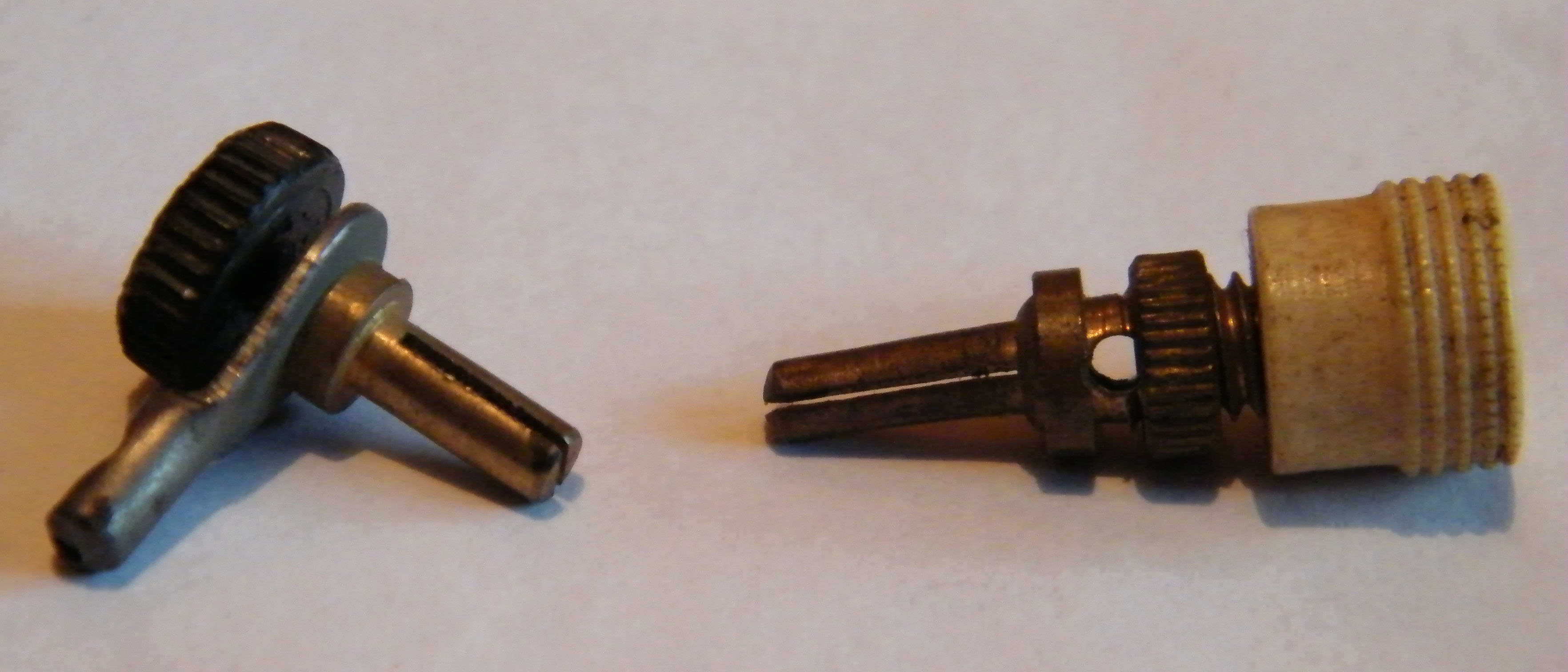 Der Linke ist von der Art, der sich mit der Rändelschraube spreizen läßt. Er hat einen Steckerdurchmesser von 3,5mm. Der Rechte ist nur wie ein Bananenstecker einsteckbar. Sein Steckerdurchmesser ist 3,7mm.
