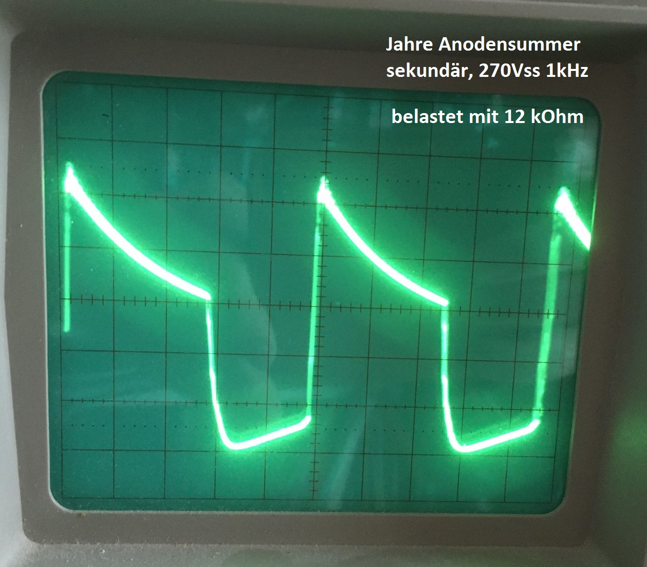 Nun gibt es eine Menge Zerhackerpatronen bis zur Einführung von Transistor- radios in Fahrzeugen Anfang der 1960-er Jahre. Der Annodensummer von Jahre ist anders. Man kann an der Einstellschraube drehen wie man will, der Summton liegt immer im Bereich um 1 kHz. Im Leerlauf entsteht an der Sekundärwicklung eine Spannung von weit über 1kV. Eine Belastung mit einem Widerstand von 12 Kiloohm und Zufügung eines Löschkondensators parallel zum Kontakt von 150nF reduziert die Funkenbildung enorm.