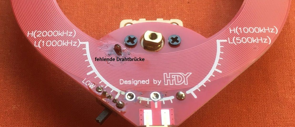 Die MW-Antenne sollte bei meinen 630m Ausbreitungsversuchen helfen. Es zeigte sich auf MW keinerlei Resonanz. Nach der Demontage des Drehkos konnte eine fehlende Drahtbrücke gefunden werden. Nun mass die Gesamtinduktivität der beiden Teilspulen 495µH bei maximaler Kapazität des Drehkos von 270pF.
