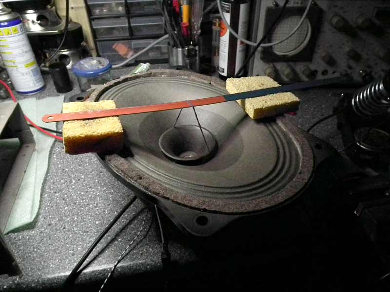 Kann man diese Asymmetrie in der Aufhängung irgendwie mit Hausmitteln schnell korrigieren? Nochmal den Lautsprecher die gleiche Zeit Liegenlassen, jetzt aber mit der Öffnung nach unten, scheidet aus Altersgründen aus.