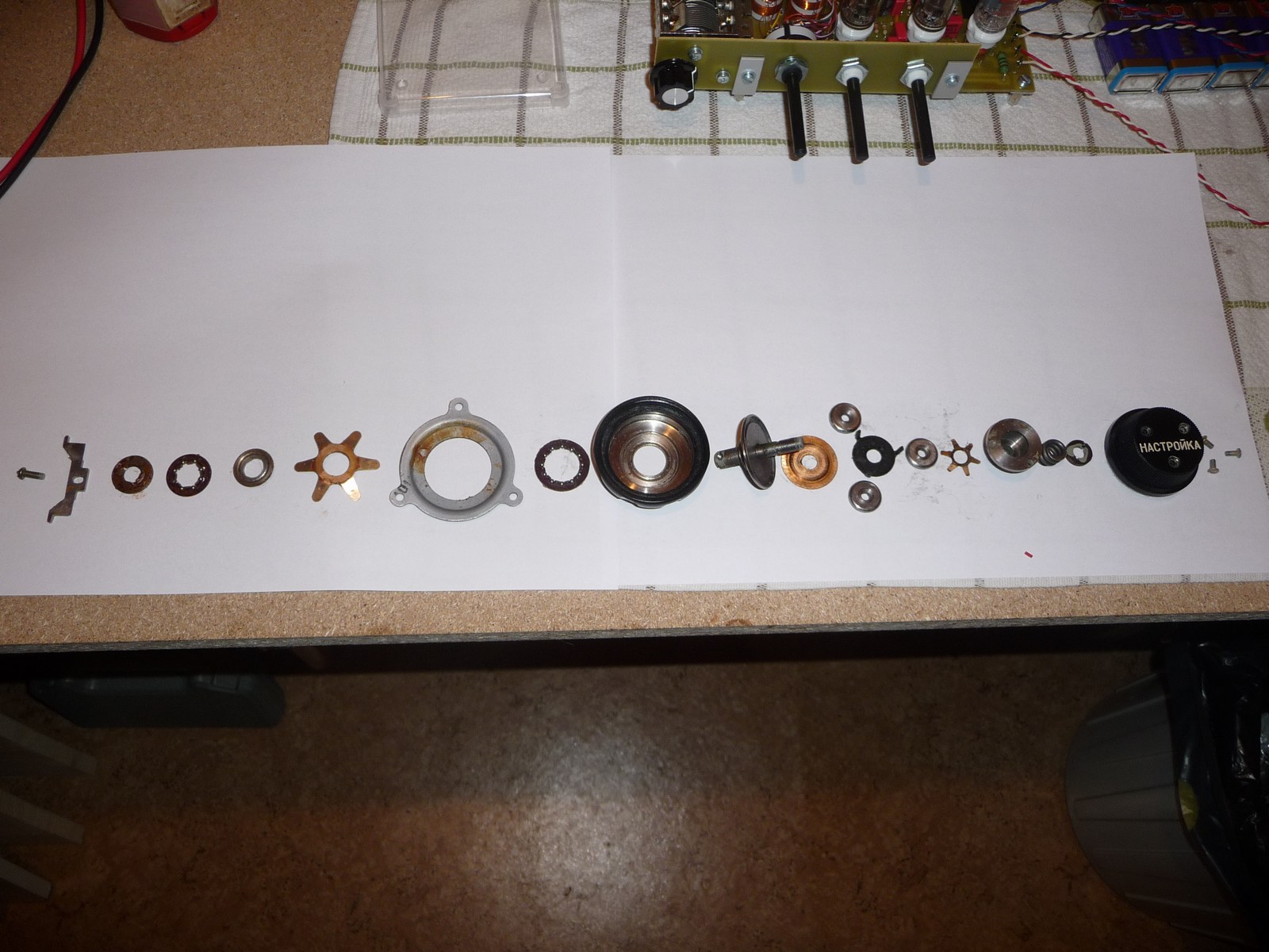 Na ja, sooo schlimm ist es nicht, den Nastroika zu zerlegen. Ist eben robuste russische Technik. Nichts dabei, was irgendwie davonspringen kann, oder was sich nich wieder problemlos in seine angestammte Position setzen lässt. Mehr als etwas Geduld und eine ruhige Hand braucht man eigentlich nicht. Eine alte Skalenscheibe um die Zahlen/Buchstaben herum zu putzen stelle ich mir langwieriger vor...
