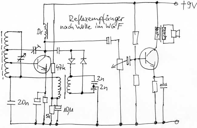 die Handzeichnung belegt eindrucksvoll, die diversen Möglichkeiten, einen Reflexempfänger aufzubauen. Hier also eine entdämpfte HF-Stufe, eine Vollweg-Gleichrichtung und zwei NF-Stufen.