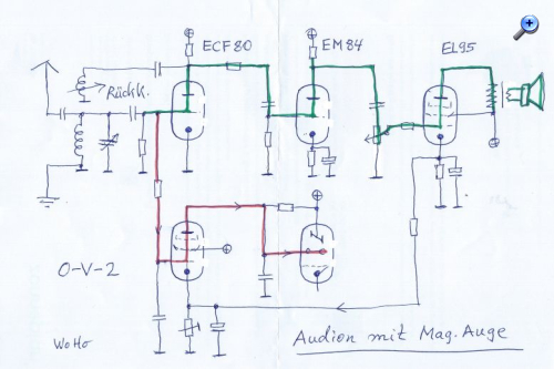 Hier das vereinfachte Schaltbild: Oben links die normale Audionschaltung mit Rückkopplung. Am Gitter der Triode ECF80 ensteht die neg. Richtspannung. Über einen Hochohmwiderstand wird diese abgezweigt (in rot) und zur Pentode der ECF80 geführt. An derer Anode erhalten wir die verstärkten Gleichspannungsschwankungen, welche zum Steuersteg der EM84 gehen. Kondensatoren sorgen für eine Beruhigung der feldstärkeabhängigen Anzeigespannung. Gut hörbare Radiostationen lassen die Fächer deutlich auf einander zubewegen!