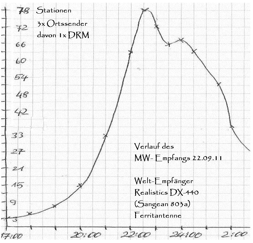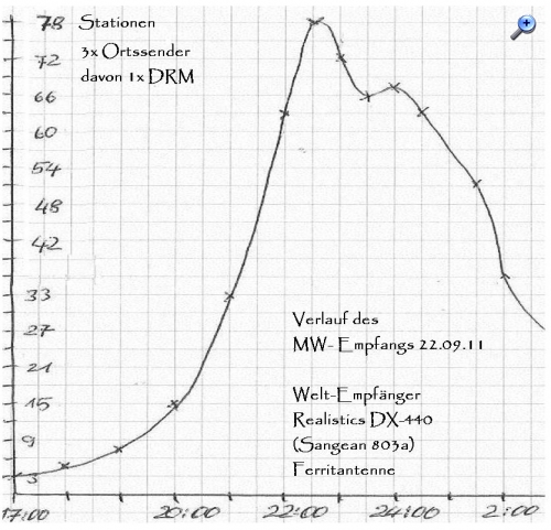 hier noch eine Kurve zum Verlauf des MW- Empfangs in den gestrigen Abendstunden. Die angezeigten 78 Stationen beziehen sich auf alle empfangbaren Signale. Also auch sehr schwache, teilweise überlagerte Stationen und DRM Rauschen.