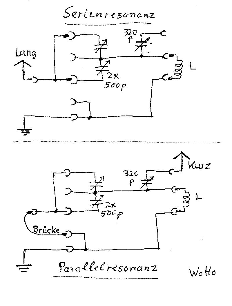 Die Radiohersteller spielten auf diese Umstände ein und machten den Eingangskreis umschaltbar! Die sogenannte Kurz-Lang Schaltung. Also, für lange Antennen mit großer Eigenkapazität, wurde die die Spule in Reihe mit dem Drehko geschaltet. Kurze Antennen (etwa 2-4m) dagegen zeigen eine kleine Eigenkapazität. Hier ist die Spule parallel an den Drehko gelegt, was dann später Standard wurde.