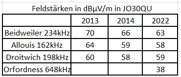 nach meiner heutigen Vergleichsmessung dürfte der Sender Beidweiler, Luxemburg, 234 kHz die Leistung mehr als halbiert haben (-4,7dB). Feldstärke 66dBV/m