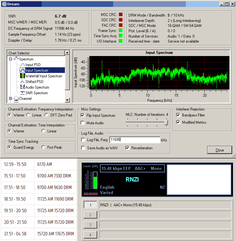 auf 11725 kHz geht jetzt um 21:00 MESZ der Empfang von Neuseeland gut. Für DRM auf 11690 kHz reichte es heute leider nicht. Nur die Stationskennung konnte dekodiert werden: