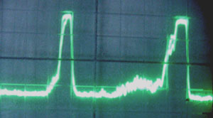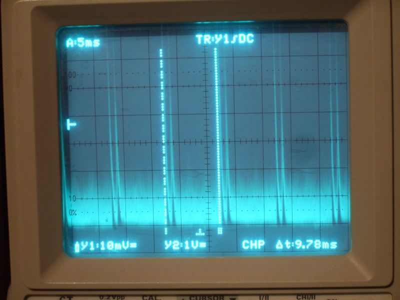 Hallo an alle, etwa 25 Sender sind bei mir mit einem Grundig Music Boy (1950, mit Ferritantenne und Germaniumtransistoren) zu identifizieren, vernünftig hören kann man nur wenige. Die eingefangenen Störungen aus der Nachbarschaft sind sehr hässlich. Eine besonders, die zieht sich über den gesamten Wellenbereich und wird nur unterdrückt, wenn die einfallenden Sender besonders stark sind. Das Bild zeigt die Störung nach der Demodulator-Diode am Eingang zum NF-Teil, 2 ms pro Teilstrich. Theoretische Frage: Läst sich so etwas ähnlich wie mit einer Brummkompensation reduzieren, ohne die gewünschte NF zu treffen? Gruß, regency