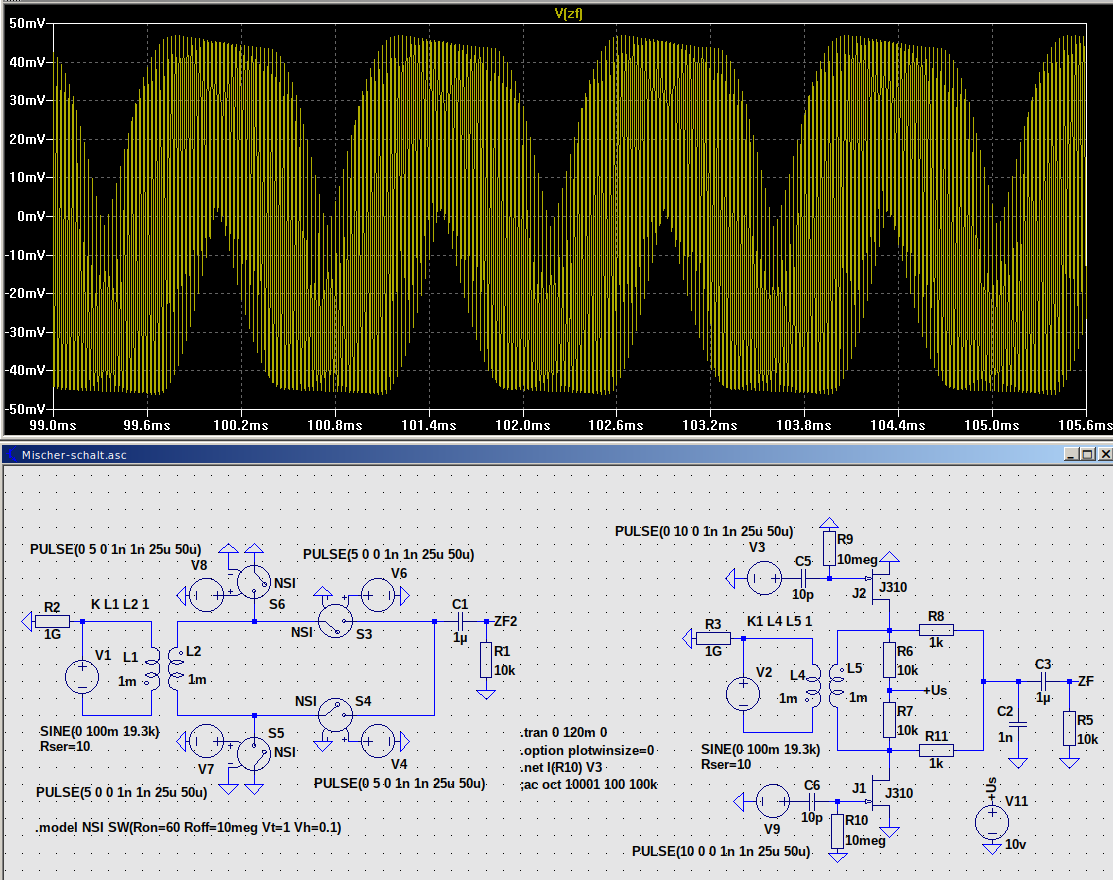 Stimmt, der T-Mode Mischer funktioniert auch so (hoffe, ich habe Dich richtig verstanden). Für den Mischer nach Ha-Jo Brandt müßten aber R8 und R11 durch zwei weitere Fet ersetzt werden und die bräuchten für die Source einen Massebezugspunkt, der meiner Ansicht nach nur mit einem Trafo mit Mittelanzapfung realisierbar wäre oder weißt Du vielleicht auch dafür einen Trick? Sorry für meine lange Leitung.