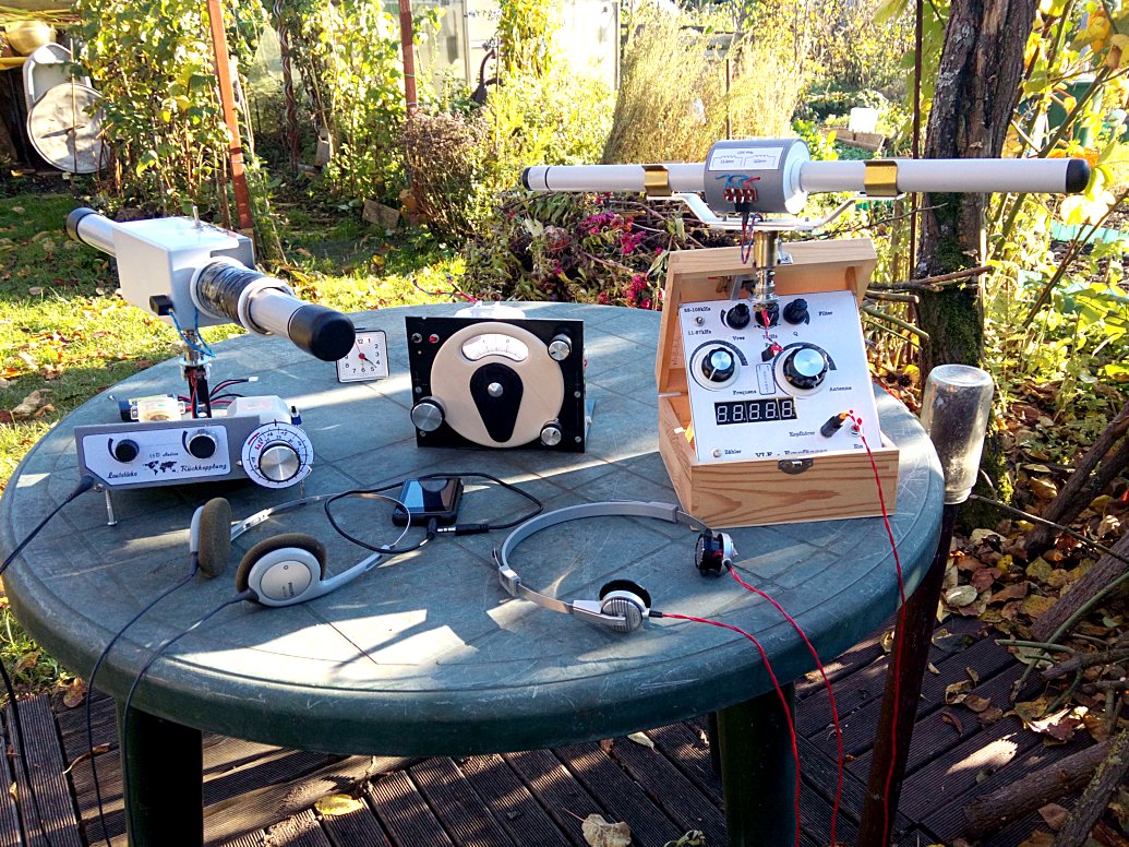 Noch ein Foto vom Kampfplatz: Ganz links ein 1,5V Rückkopplungsempfänger mit Peltz Oszillator - leider zu schwach. Als Antenne diente ein BAZ Modul mit Verlängerungsspule. In der Mitte der erwähnte Röhren-RX und rechts der Direktmischer mit dem Eigenbau Ferrit. Das kleine Schwarze Kästchen in der Mitte ist ein MP3 Player zum Mitschneiden.
