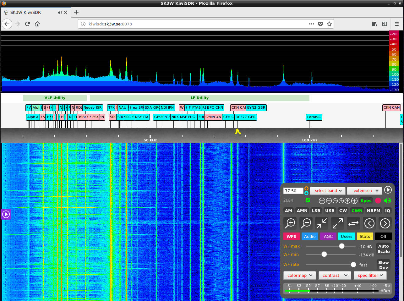 Wir stellen im Webbrowser die Frequenz von DCF77, 77.5 kHz, ein. Als Demodulationsart nehmen wir CW-Narrow, ggf. ist das Signal mit dem digitalen Filter noch besser einzustellen. Das angepeilte Ziel sollte möglichst rauschfrei reinkommen, das erleitert die spätere Peilung.