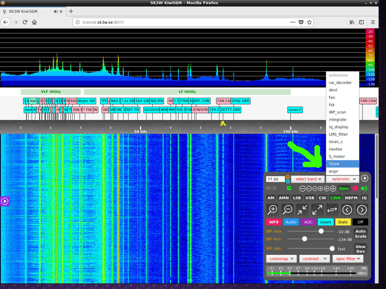 2. Nun wählen wir in der Auswahlbox "extension", die TDoA Erweiterung die wir zur Peilung des Senders nutzen aus, siehe grüner Pfeil.