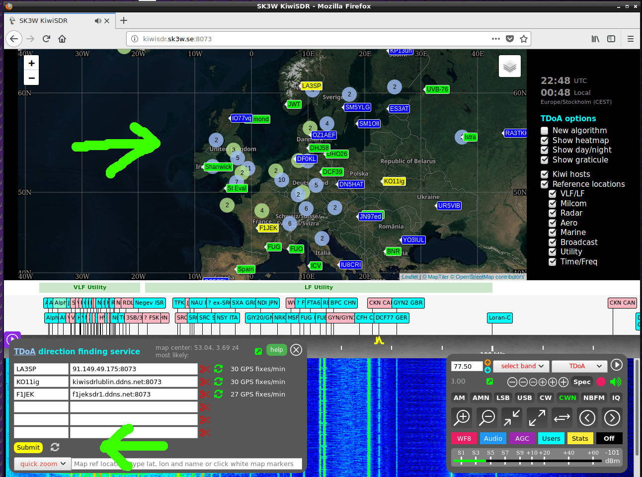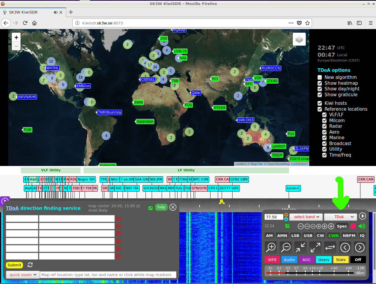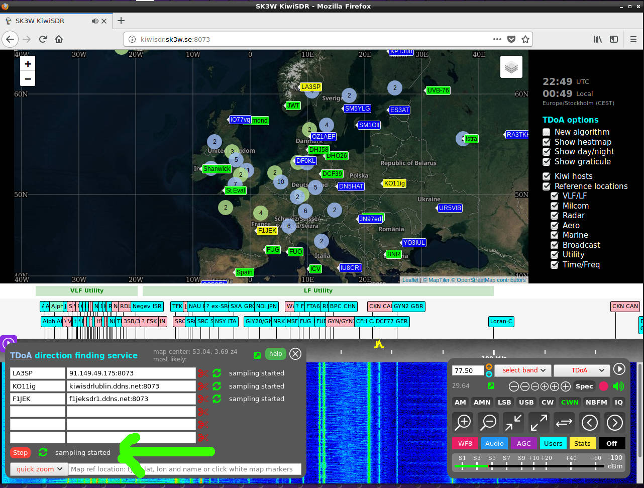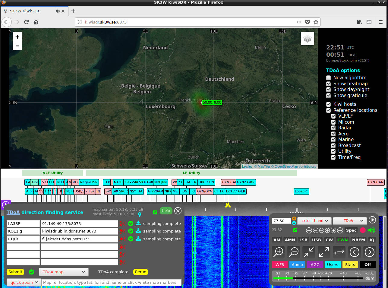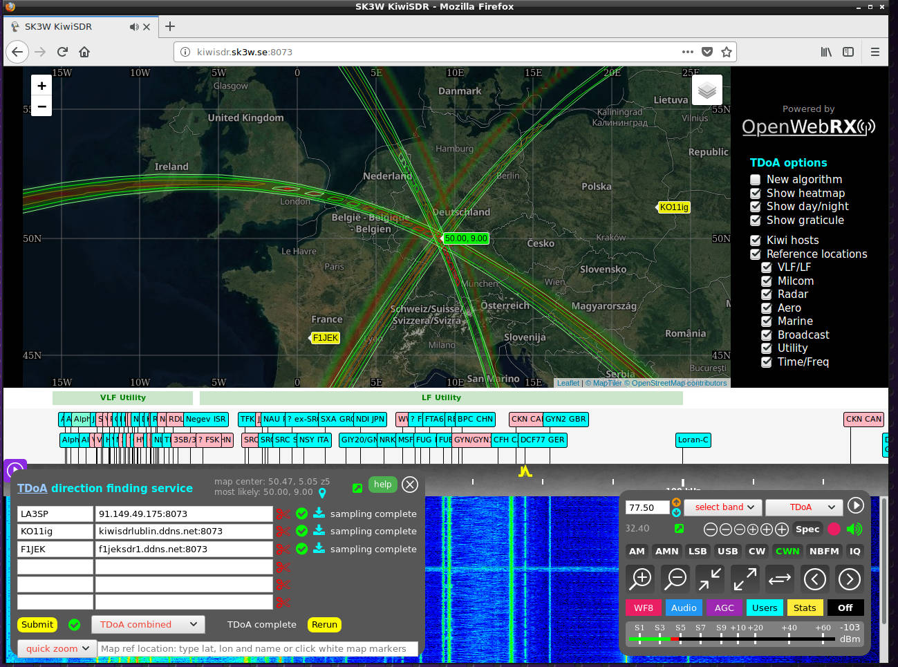 Wie wir ja alle wissen breiten sich die Funkwellen vom Sender zum Empfänger praktisch mit Lichtgeschwindigkeit aus und obwohl das Signal in einer Millisekunde knapp 300 km zurücklegt, lassen sich mit hochgenauen Uhren Laufzeitunterschiede zu den einzelnen Empfängern nachweisen. Umgedreht ist es dadurch möglich die Entfernung vom Empfänger zum Sender zu bestimmen. Nun diese Prinzip ist alt und ich habe es vor einiger Zeit schon bei einem Hobbyfreund in Stockholm mit in Anwendung gebracht um dort fehlerhafte ADS-B Aussendungen von Flugzeugen dazu zu benutzen, eine "Triangluation" vorzunehmen, um die Position eines Flugzeuges zu bestimmen. Nun gib es nicht nur die interessante Frequenz 1090 MHz, sondern auch noch viele andere Frequenzbänder auf dem so eine Peilung nach dem TDoA - Verfahren (Time difference of arrival) möglich ist. Was eigenet sich da besser als die "Schwarmintelligenz" vernetzter SDRs zu nehmen? Glücklicherweise gibt es genug Betreiber im Netz die Ihre Empfänger der Öffentlichkeit zur Verfügung stellen und am Besten eignen sich Geräte die mittels der Software "OpenWebRX" im Netz hängen. Im Netz findet man auf der Webseite https://sdr.hu/ eine Übersicht aller im Netz befindlichen SDR, die genau mit diesem OpenWebRX im Netz hängen. OpenWebRX unterstützt eine Liste voll unterschiedlicher Emfänger und noch nicht unterstützte Geräte lassen sich mittels einer übersichtlichen API leicht einbinden.